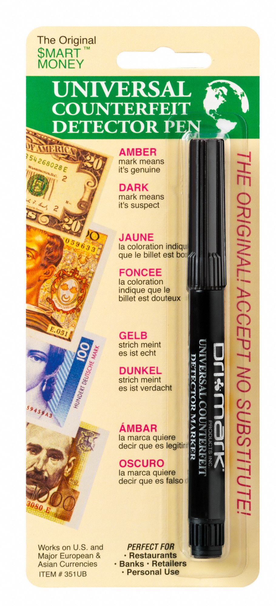 Counterfeit Detector Pens Made In The Usa Dri Mark Products Inc from 4asxa01znsw22pv9onazkcl1-wpengine.netdna-ssl.com The unique ink in the detector pen identifies notes quickly & easily. Ordinary paper contains starch while u.s. The pen does nothing but detect bills printed on normal copier paper instead of the fine papers used by the u.s. It says on the pen that it is 'effective on most currency series 1959 and after.' The pens are supposed to. Safescan 30 counterfeit detector pen the safescan 30 is the ideal portable partner for checking whether a banknote is genuine or counterfeit. It is estimated that more than 1 in every 10,000 bills is counterfeit. A real bill won't react, because cotton and linen don't have starch.