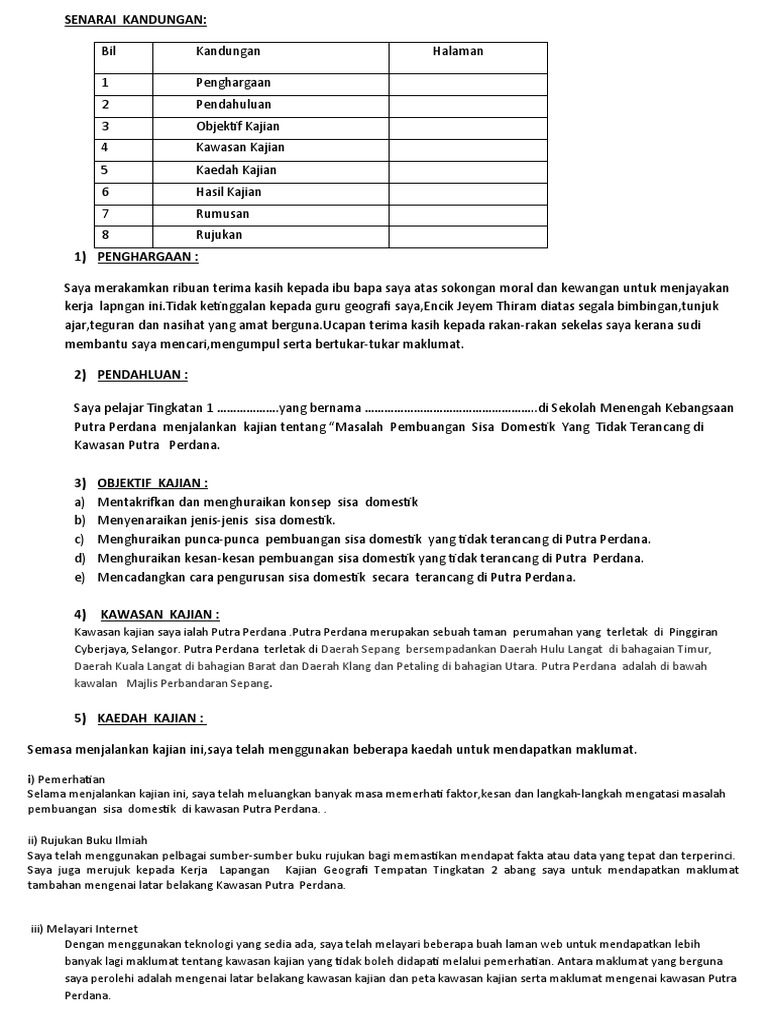 Kerja lapangan geografi bahan domestik. Contoh kerja kursus geografi 2011 1. Contoh pendahuluan folio geografi tingkatan 1 sisa domestik. Contoh kerja lapangan docx contoh kerja lapangan tajuk fenomena pembuangan sisa domestik di sekitar taman sepakat kepong selangor disediakan oleh nama course hero. Kkeerrjjaa kkuurrssuuss ggeeooggrraaffii ppmmrr 22001122 ppeerrnniiaaggaaaann 3. Contoh soalan karangan bm tingkatan 1 pertanian, contoh soalan karangan bm tingkatan 1 2020, contoh soalan. Sebagai contoh, ada orang yang sukar sekali mendengar. Geografi tingkatan 1 bab 13 sisa domestik. Peta topografi bab 3 : Contoh pendahuluan folio geografi tingkatan 1 sisa domestik. Kerja kursus geografi tingkatan 3 2013: Contoh borang soal selidik geografi pt3 tugasan 2015 : Pt hj salleh ros mengenai sisa domestik dan masalah yang dihadapi akibat pengurusan sisa domestik yang tidak sistematik.