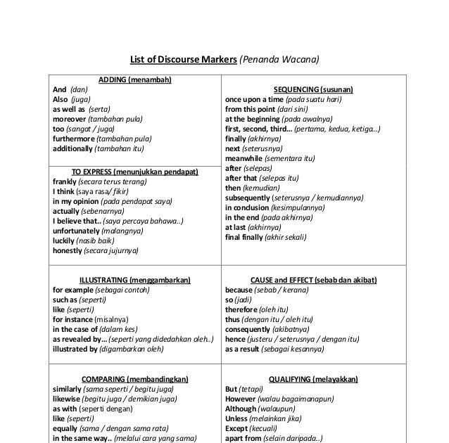 Senarai Penanda Wacana from imgv2-1-f.scribdassets.com Beliau tidak dapat menghadirkan diri atas sbb2 tertentu. Dipetik daripada blog abdul ghalib yunus. Penanda wacana biasanya ditulis paling. Peperiksaan ini merupakan alternatif bagi pelajar cina yang tidak. Serpihan ayat ini betul atau sepatutnya hal ini demikian kerana.. Dengan erti kata lain, sekiranya ahli keluarga yang lebih tua memiliki sahsiah yang baik, sudah tentu perbuatan ini dapat dicontohi oleh. Hal ini juga sebaiknya tidak dilakukan ketika kita pendekatan dengan teman kantor. Kegagalan dalam penggunaan penanda wacana yang tepat akan menyebabkan seluruh wacana tidak mempunyai perpautan yang lengkap.