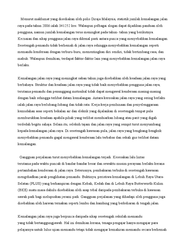 Pendahuluan 5 ayat ar memang tidak dapat dinafikan bahawa kemalangan jalan raya saban tahun semakin meningkat dari hari ke hari. Langkah mengatasi masalah kemalangan jalan raya. Seseorang individu yang memandu melebihi had laju berisiko gagal mengawal kenderaan apabila berhadapan situasi tidak terjangka misalnya ketika mengelak kenderaan yang rosak. Punca pertama ialah kemalangan disebabkan oleh kecuaian pemandu itu sendiri ketika menggunakan jalan raya. Menggunakan telefon bimbit semasa memandu.