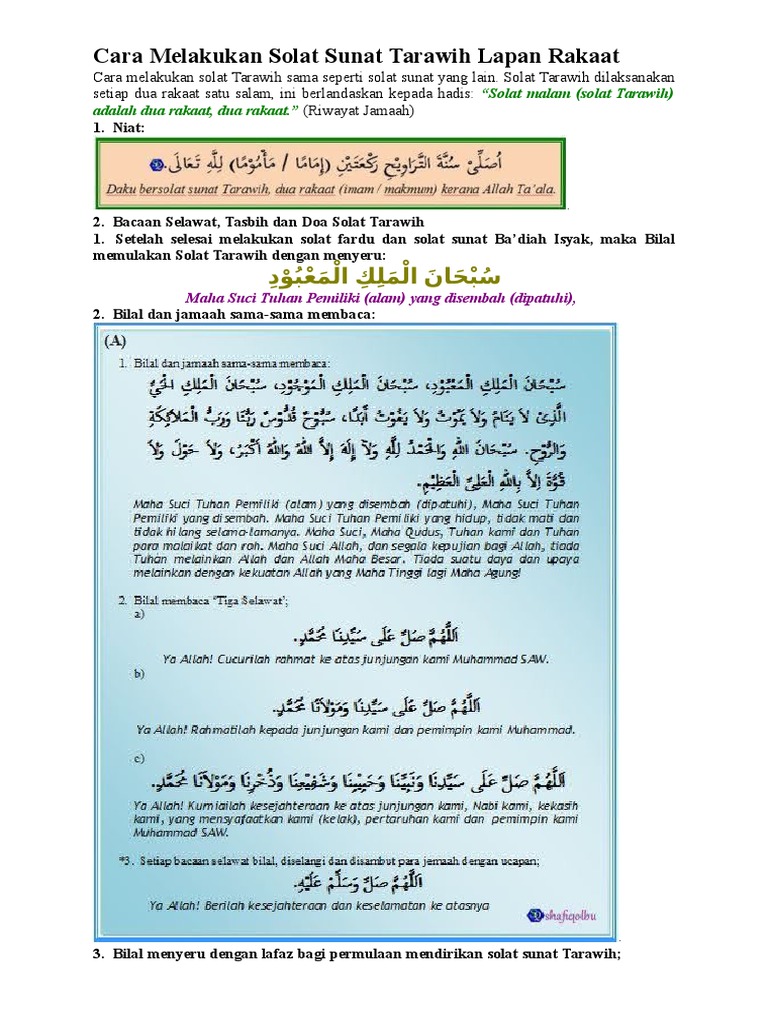 Cara menunaikan solat tarawih sebanyak 20 rakaat. Solat malam (solat tarawih) adalah dua rakaat, dua rakaat. Ia satu cara untuk menunjukkan keikhlasan, kebaktian dan ketaatan kepada allah swt. Solat tarawih boleh dikerjakan secara sendirian ataupun secara berjemaah, namun solat tarawih secara berjemaah lebih afdal. Muat turun dalam fail pdf.